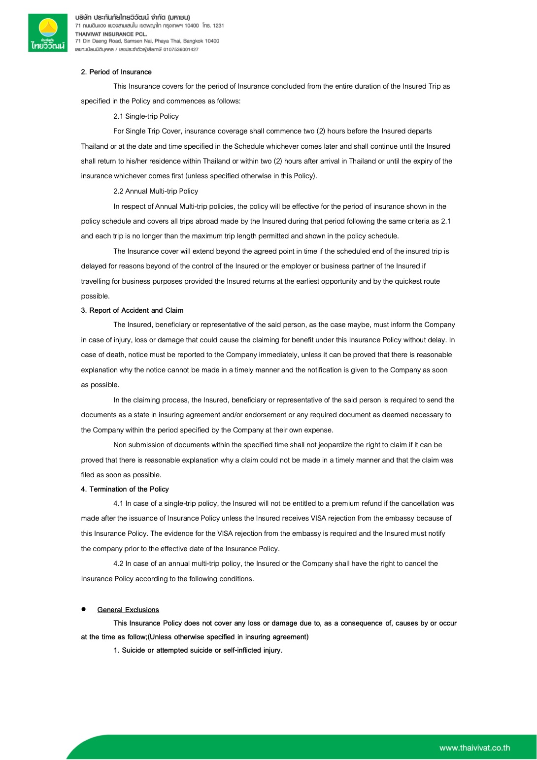4. การบริการความช่วยเหลือทางการแพทย์ฉุกเฉิน / Emergency Medical Assistance4.1 การเยี่ยมผู้เอาประกันภัยในต่างประเทศ / Compassionate visit |
